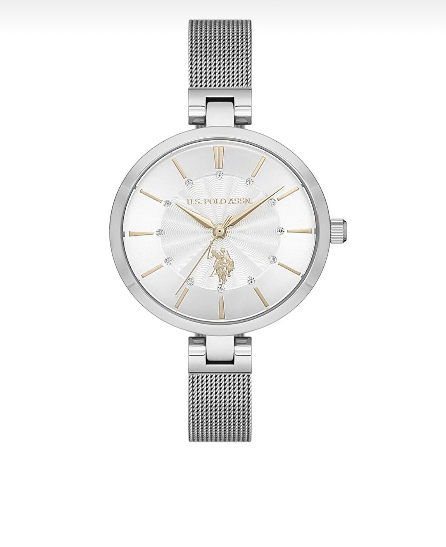 ساعت زنانه از برند U.S. Polo Assn. با طراحی ظریف و شیک، دارای بدنه و بند استیل با رنگ نقرهای و صفحهای به رنگ نقرهای با نشان اسبسوار برند است. عقربهها و نشانگرهای طلایی در کنار نگینهای ظریف بهعنوان اعداد، جلوهای لوکس و زنانه به ساعت بخشیدهاند. بند استیل مشبک (Mesh) علاوه بر زیبایی، راحتی و دوام بالایی را فراهم میکند. این مدل انتخابی ایدهآل برای استایل روزمره و رسمی است